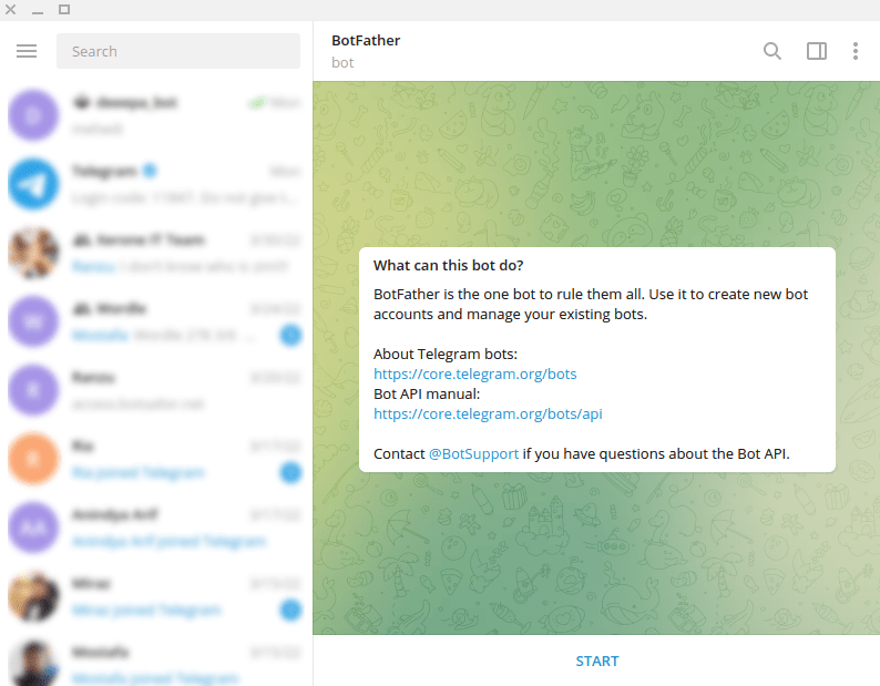 To build a Telegram bot with Qbool Social, first, open your Telegram App. Then in the search bar of the app, search with the ‘BotFather’ keyword. Then select the verified BotFather account.